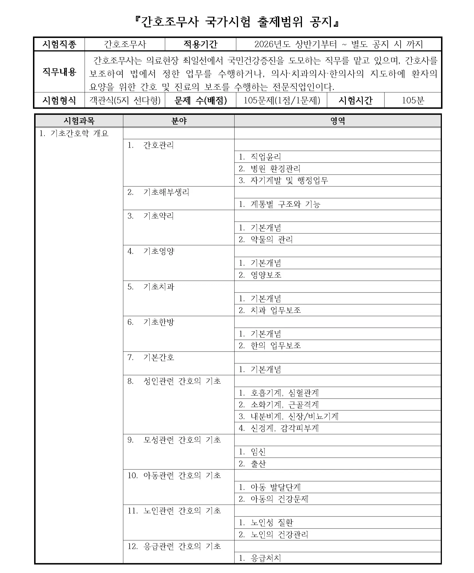 간호조무사 국가시험 출제범위 변경 공지(2025.09.)
